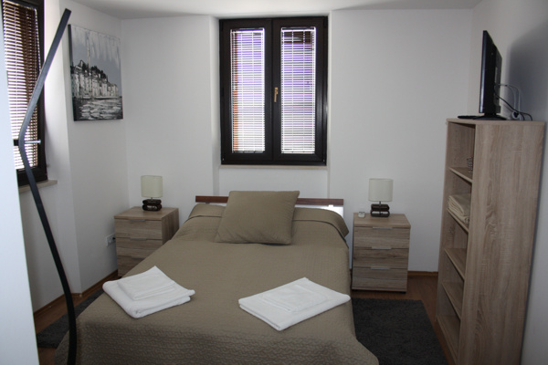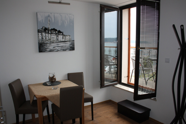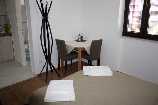 je vybaveno sprchovým koutem, toaletou, kuchyňskou linkou, lednicí, dvoulůžkovou postelí, jídelním stolem a výhledem na náměstí a moře.